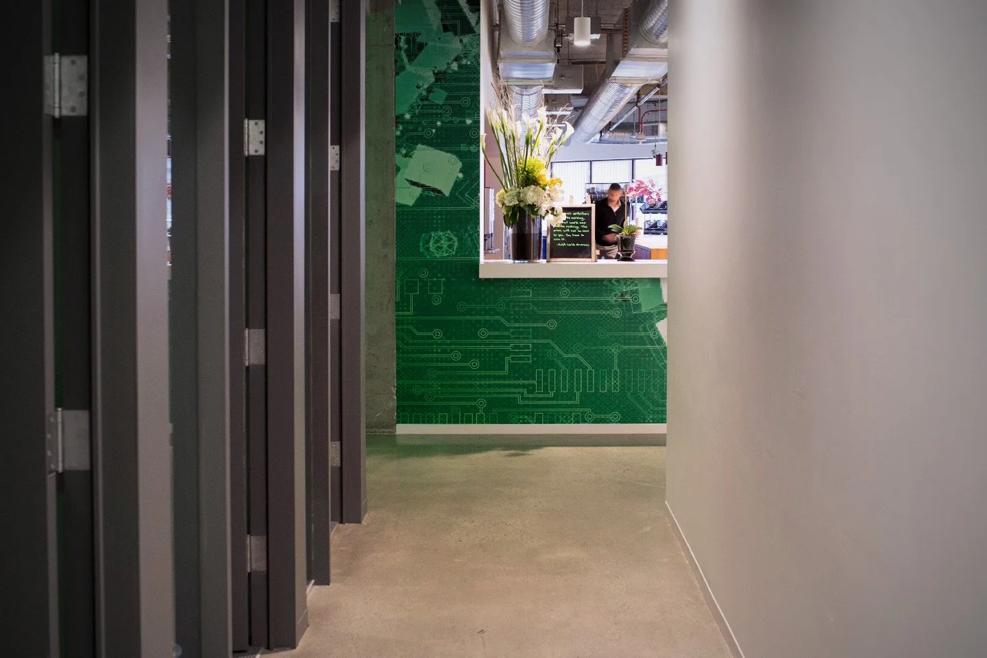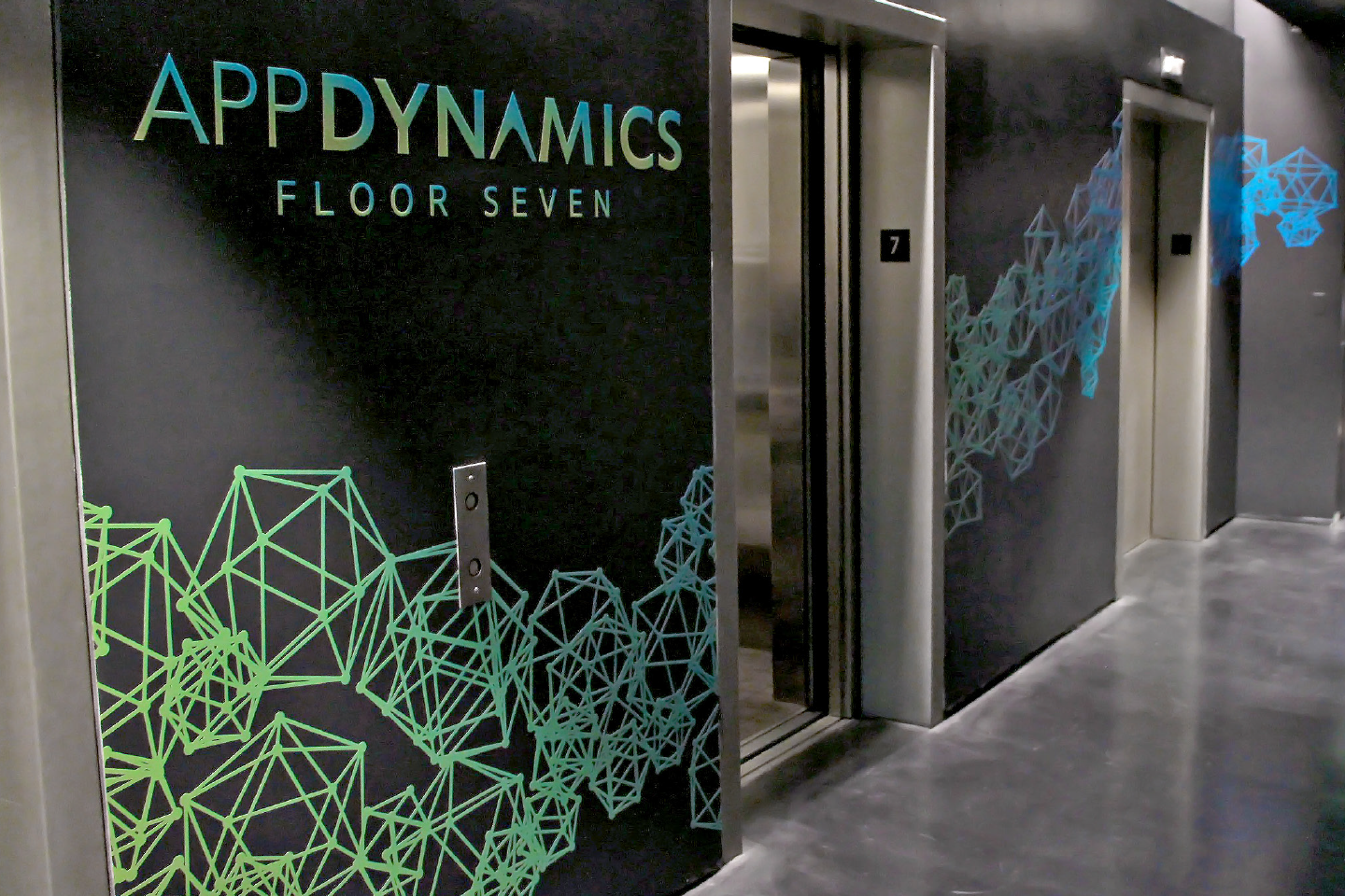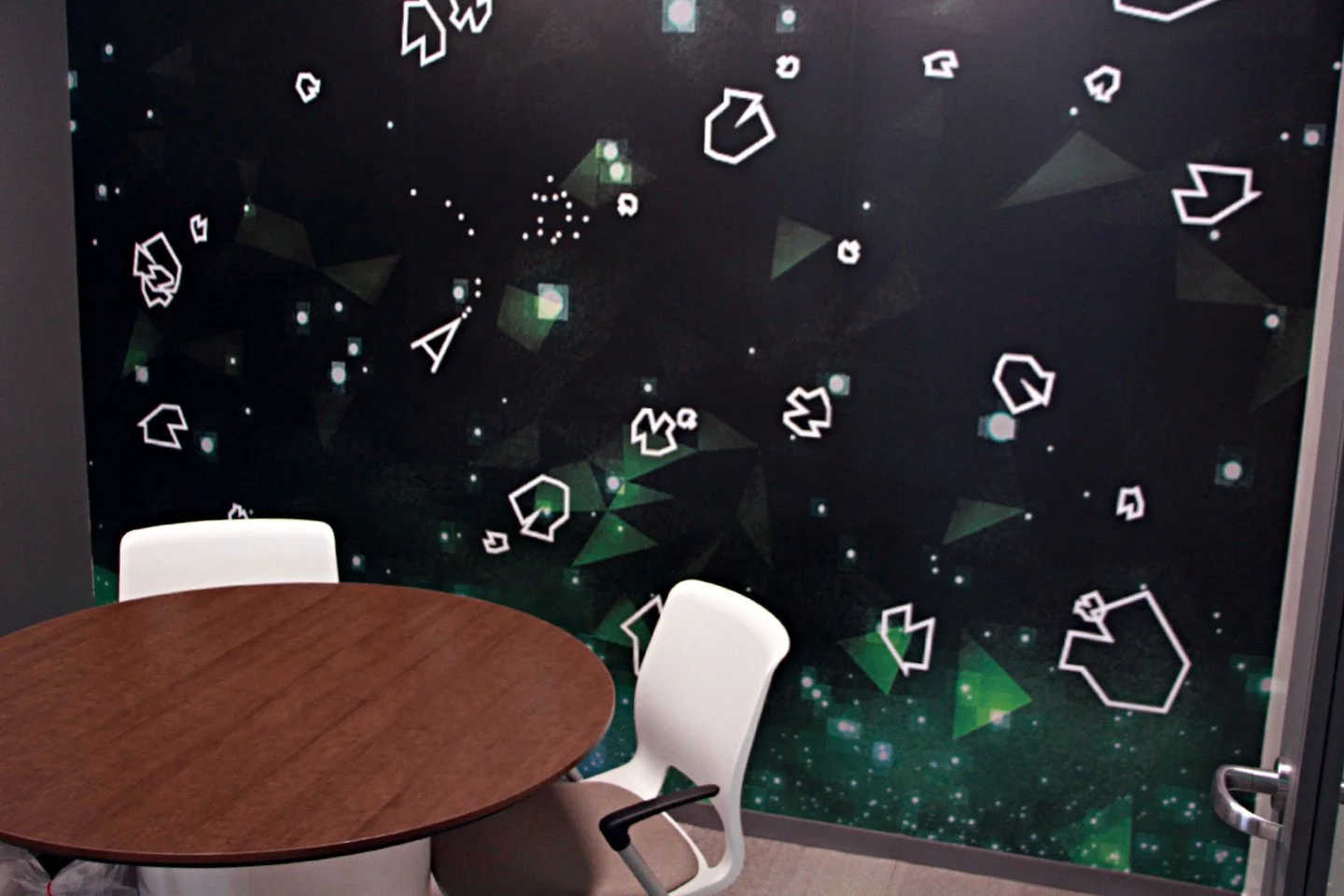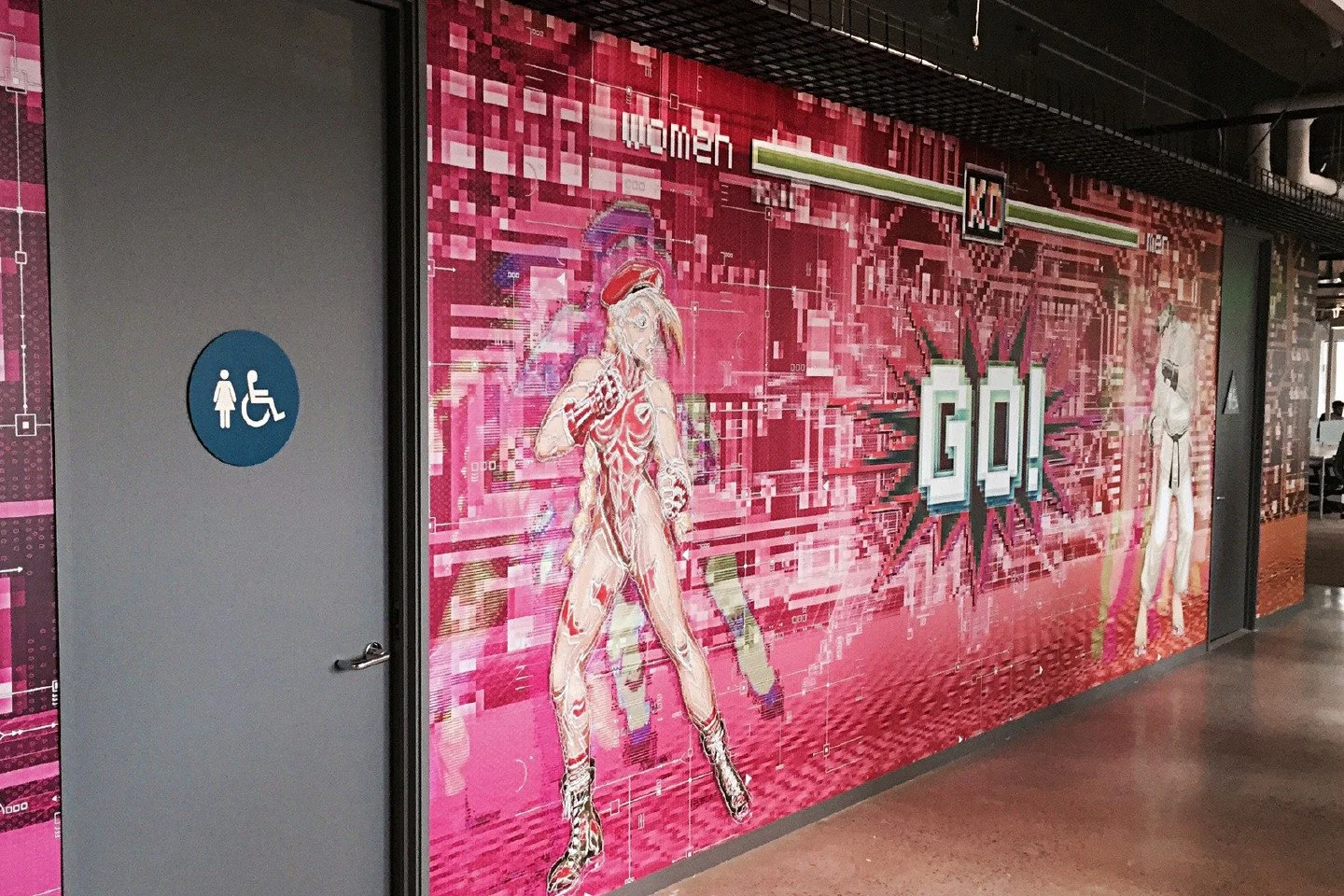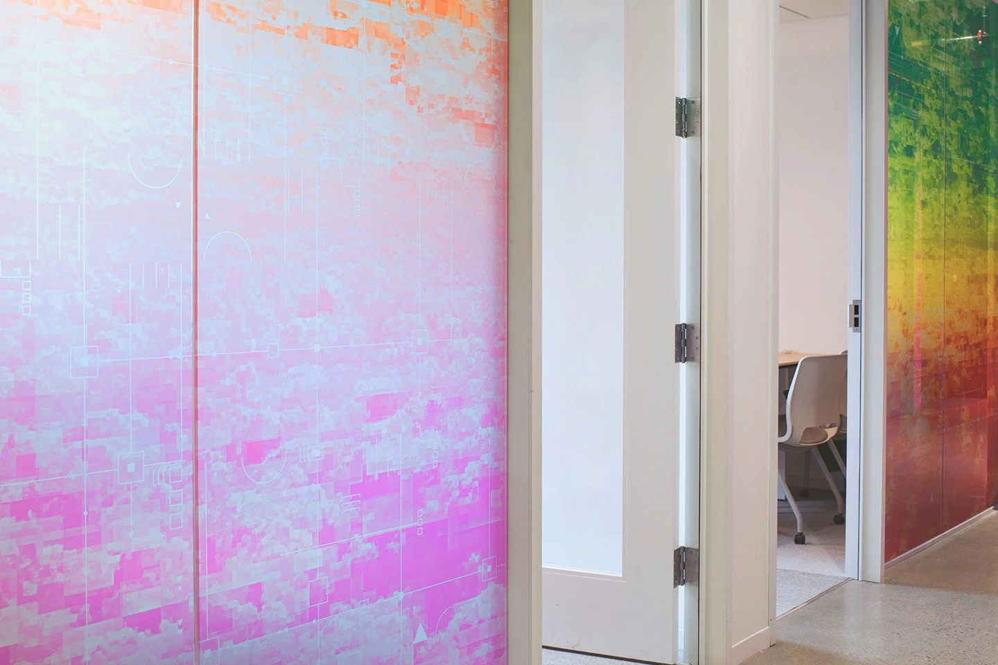 Working with Butchershop Creative in partnership with Gensler, I developed a series of custom environmental graphics for AppDynamics’ San Francisco offices. The work included wall murals, window frosting, and die-cut dichroic installations, designed to energize office and meeting spaces. Drawing inspiration from San Francisco’s culture and playful video game aesthetics, the graphics created a unique visual identity that brought warmth, creativity, and personality into a tech-focused workplace.