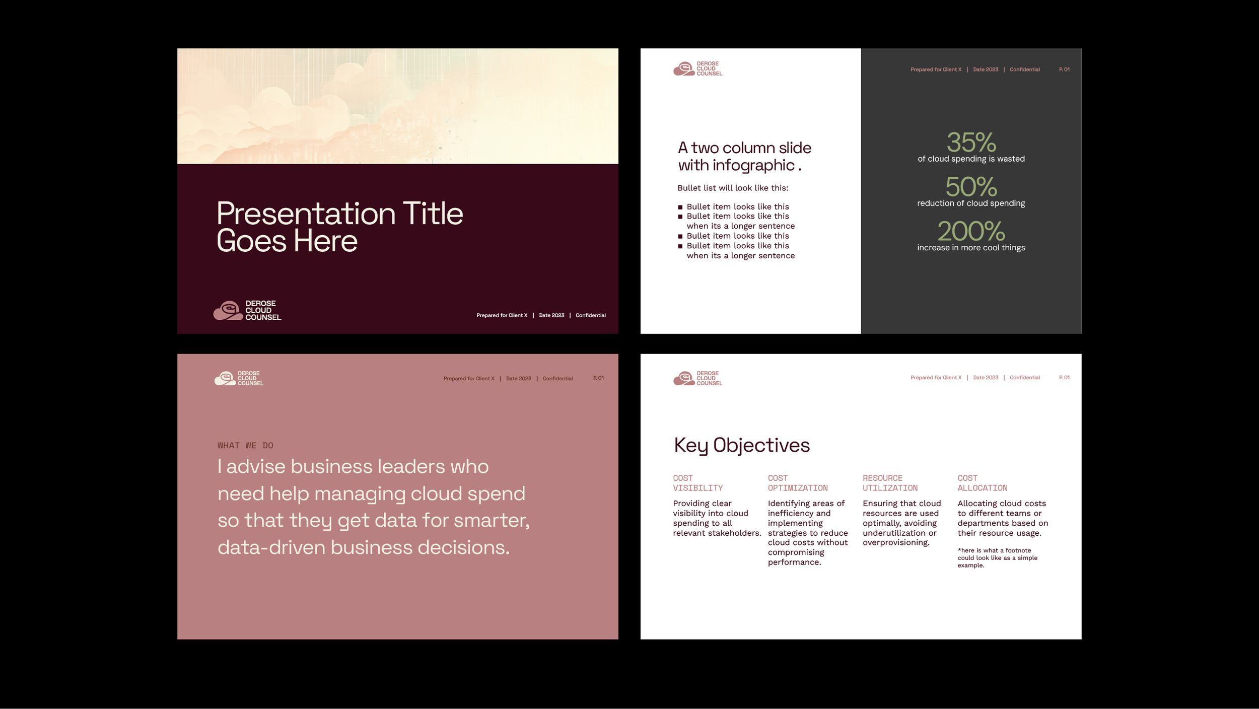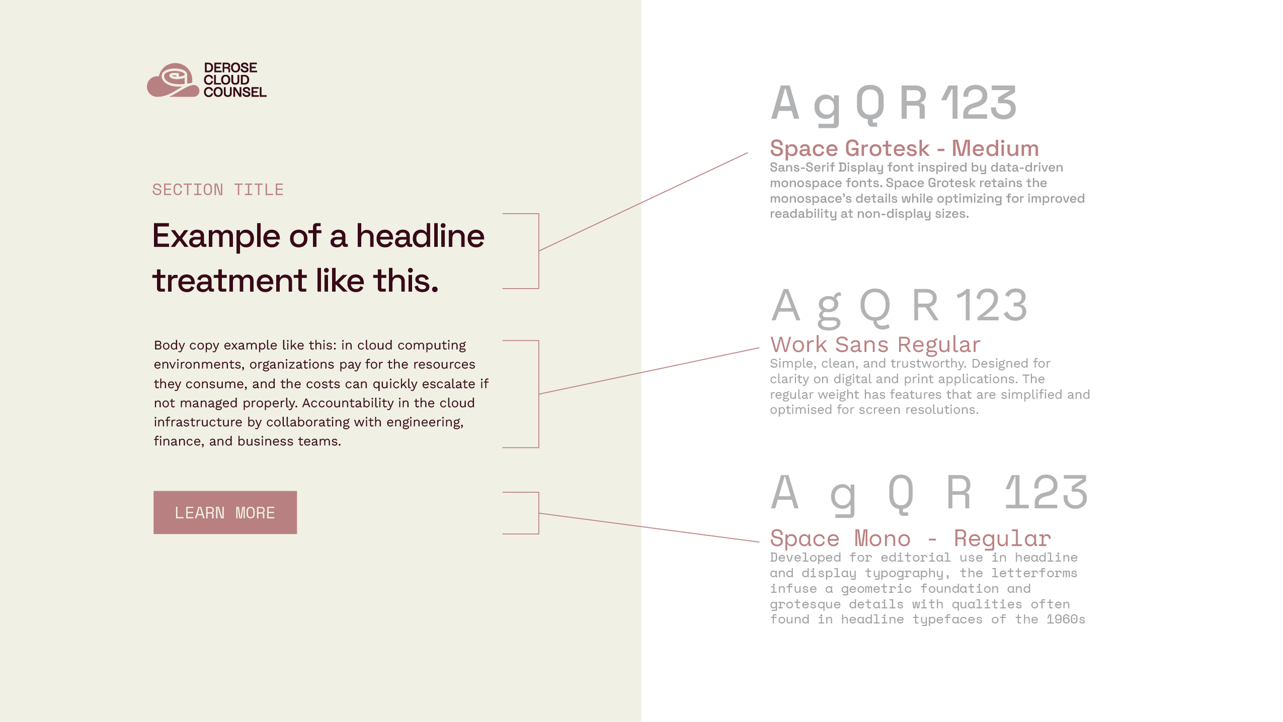 Through creative workshops and strategy sessions, we explored how industry leaders approach naming and identified opportunities to create a name that reflected both expertise and innovation. From there, I guided the client through multiple strategy presentations, exploring logo concepts and visual directions that would resonate with fintech audiences. The final identity balanced professionalism and approachability, positioning DeRose Cloud Counsel as a trusted partner for companies looking to optimize their financial technology output.
