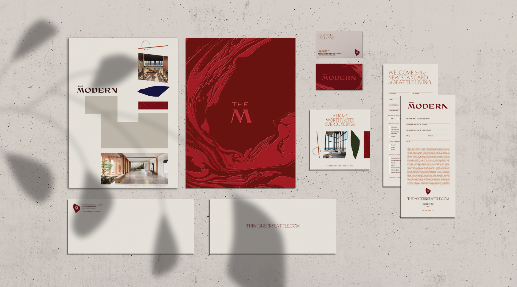 Working with Martin Selig Real Estate through Butchershop, I led brand development for The Modern, a mixed-use tower in Seattle’s Belltown. After rounds of naming options, we settled on The Modern, paying homage to Martin Selig’s distinguished art collection. Think Rothko and Calder. The identity system drew on fine art sensibilities: the color palette echoed artist pigments like Alizarin Crimson and Cobalt Blue, while the logo and visual language translated that sense of elevated creativity and ownership for future residents.