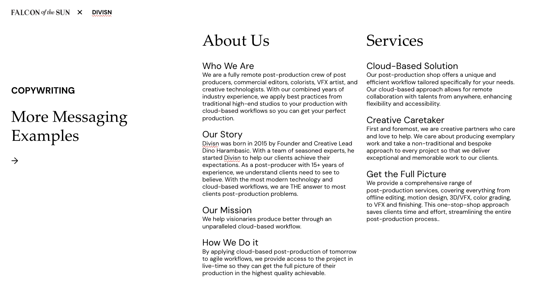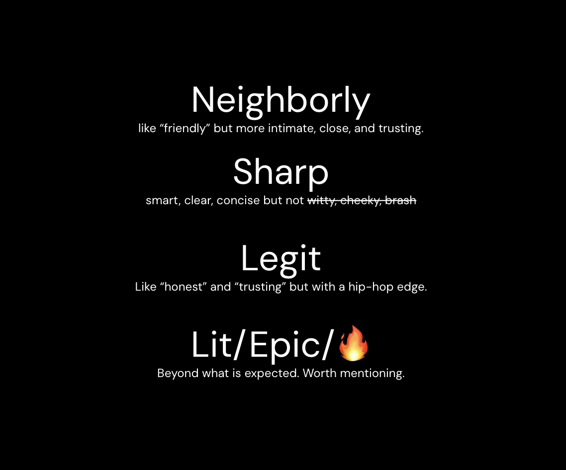 Next, we build the verbal and visual identity in tandem. The way a brand speaks should be consistent with the way it looks visually.